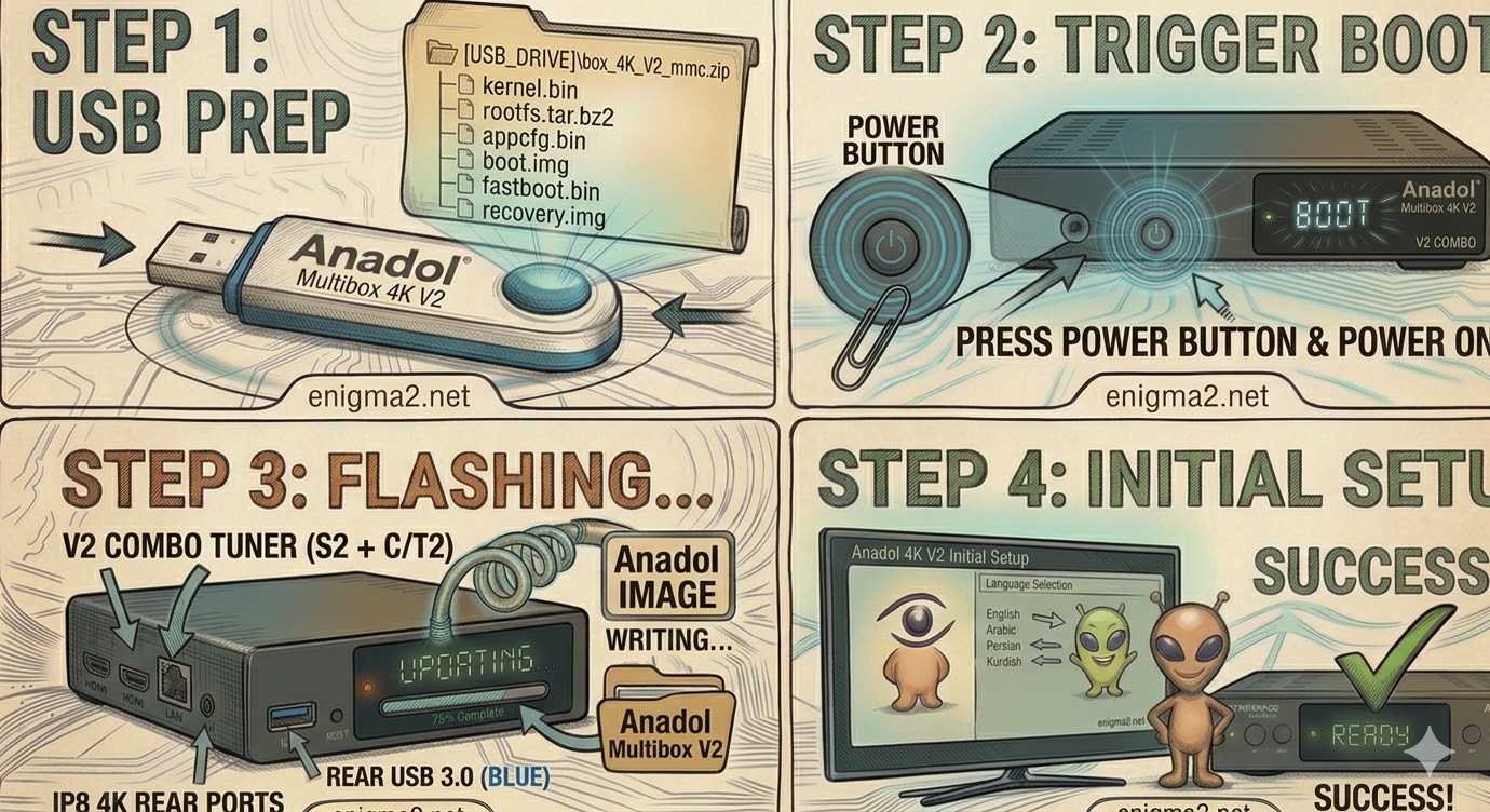 The Anadol 4K V2 (specifically the Multibox 4K V2) is a slight hardware revision of the original Multibox. For your enigma2.net readers, it is important to clarify that this model uses the newer Recovery Menu method to manage its multiboot slots, providing a much safer environment than the old legacy flash method.