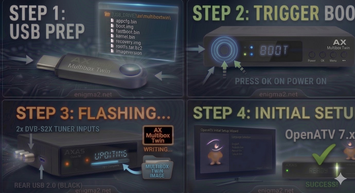 The AX Multibox Twin is a versatile 4K receiver powered by a HiSilicon chipset. Because it is a “Multibox,” it is designed specifically for multibooting, allowing you to have different images (like OpenATV, OpenHDF, etc.) stored in different internal slots.