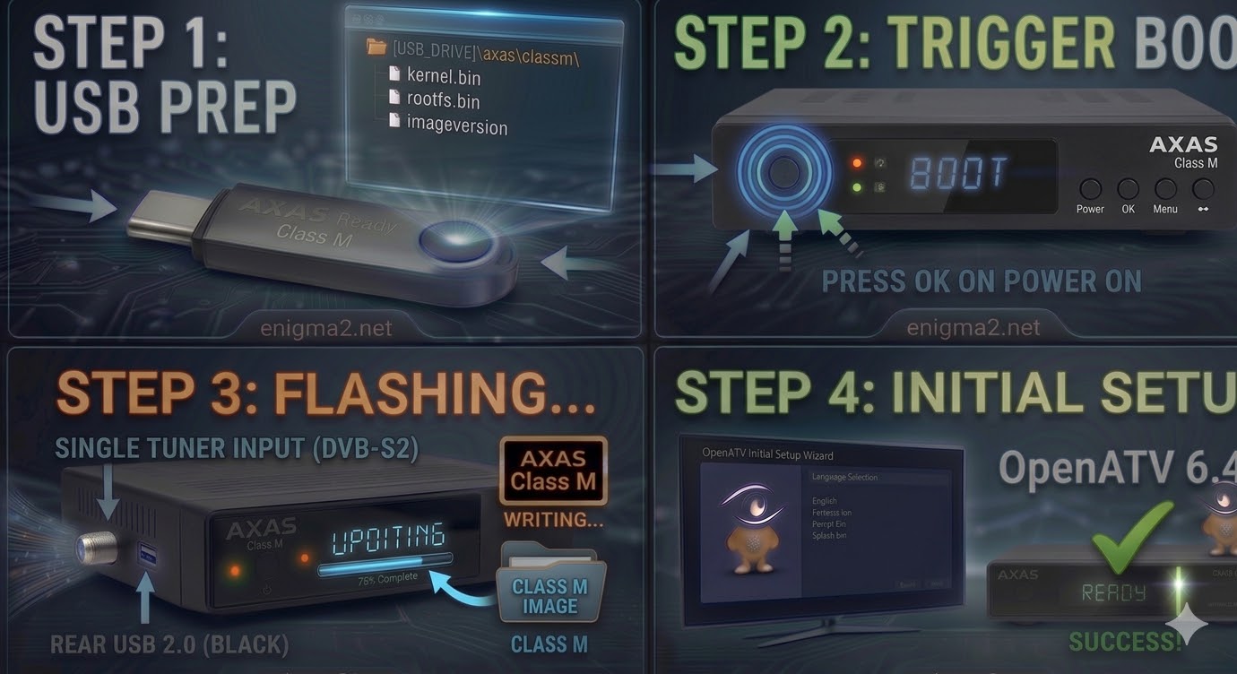 The AXAS Class M is a classic Enigma2 receiver that, while older, still follows the standard flashing logic for Broadcom-based boxes. Because this is a legacy device, it is very picky about USB drives—using a small USB 2.0 stick (4GB or 8GB) formatted to FAT32 is the best way to ensure the bootloader sees the files.