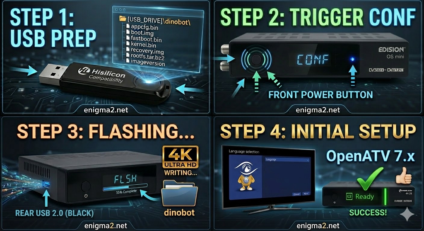 • The Folder Path: Extract your Enigma2 image (OpenATV, etc.). The root of your USB drive must contain this exact folder: