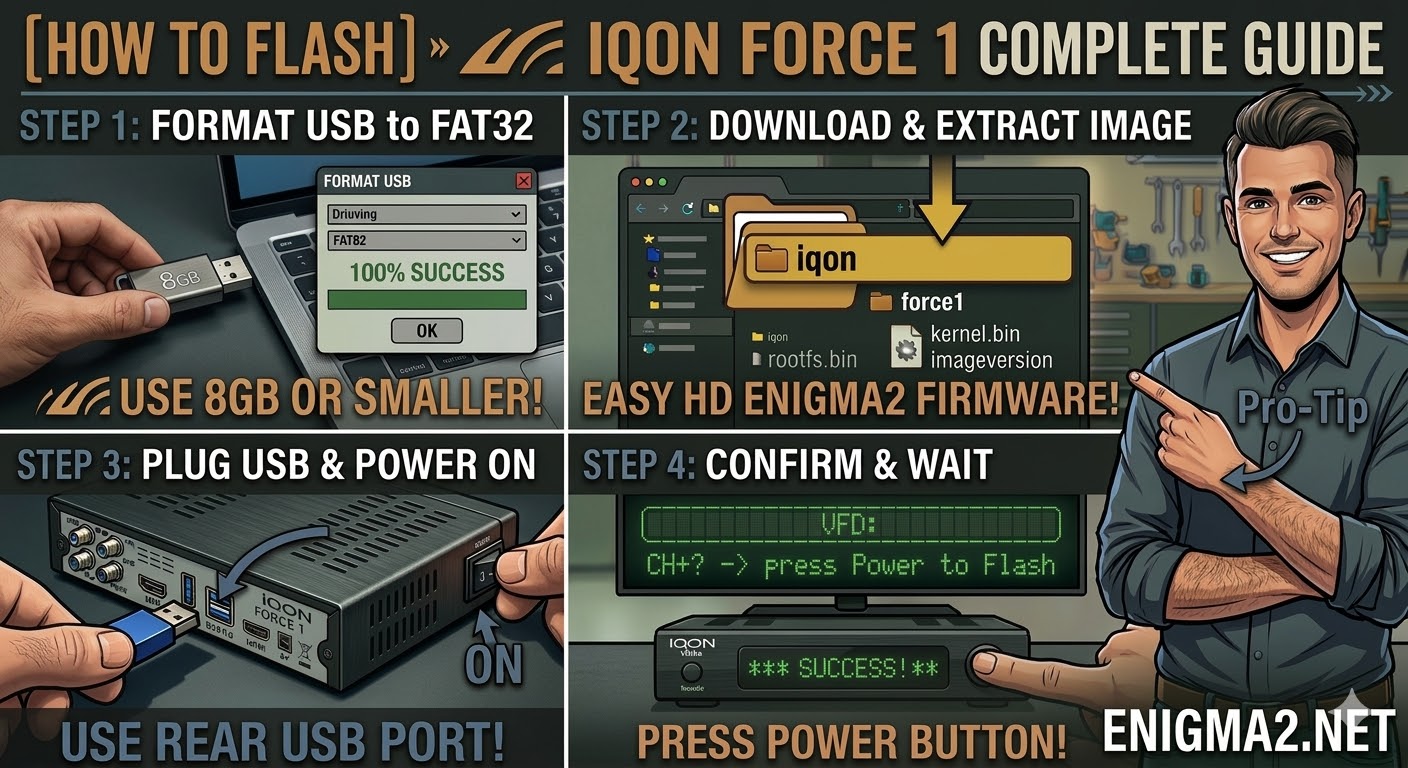 Firmware: Download the Enigma2 image specifically for the IQON Force 1 (OpenATV and OpenPLi are the most common).