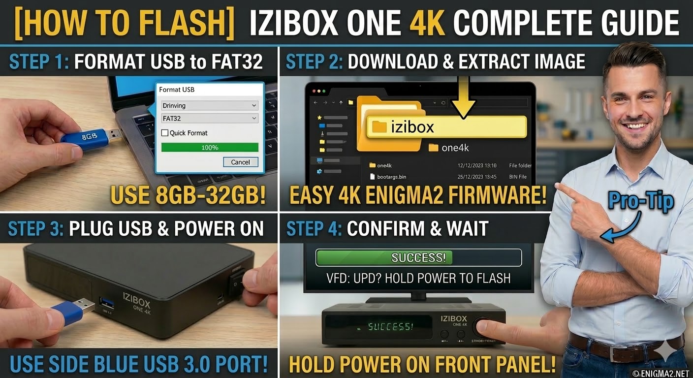 To flash the standard IZIBOX ONE 4K (non-Plus version), the procedure is nearly identical to the Plus model, but you must ensure the subfolder name on your USB stick matches the specific hardware.