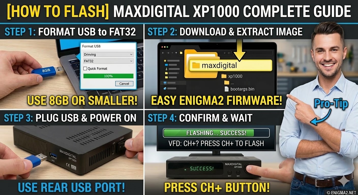 The CH+ button is the specific trigger for the XP1000 series. If the user doesn’t press it quickly enough, the box will skip the update and boot into the old image. On your site, emphasize that the folder name must be exactly xp1000 in lowercase. If they are using an image from an Octagon box, the folder might be named xp1000p—this will not work on the Maxdigital unless renamed.