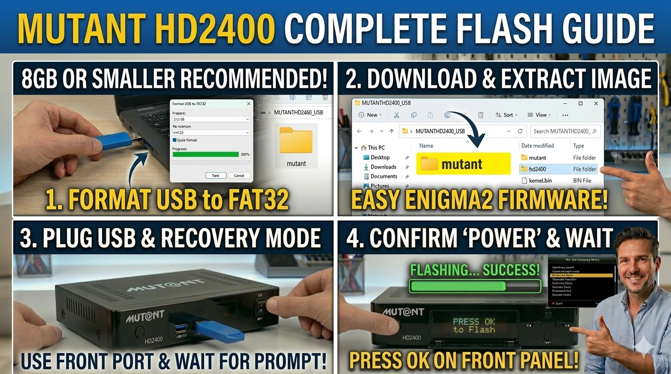 To flash the Mut@nt HD2400, we move away from the modern “Recovery Menu” of the 4K boxes and back to the classic Enigma2 flashing method. The HD2400 is a powerful, older generation Broadcom-based receiver that requires a specific button press on the front panel to initiate the process.