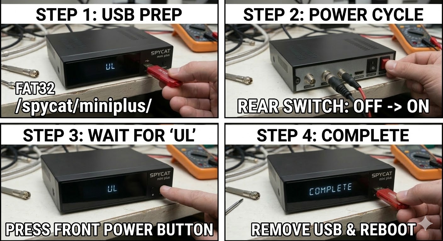 The SPYCAT Mini Plus is a compact but powerful Enigma2 receiver that follows the standard SPYCAT flashing procedure. It requires a specific folder structure to be recognized by the bootloader upon startup.