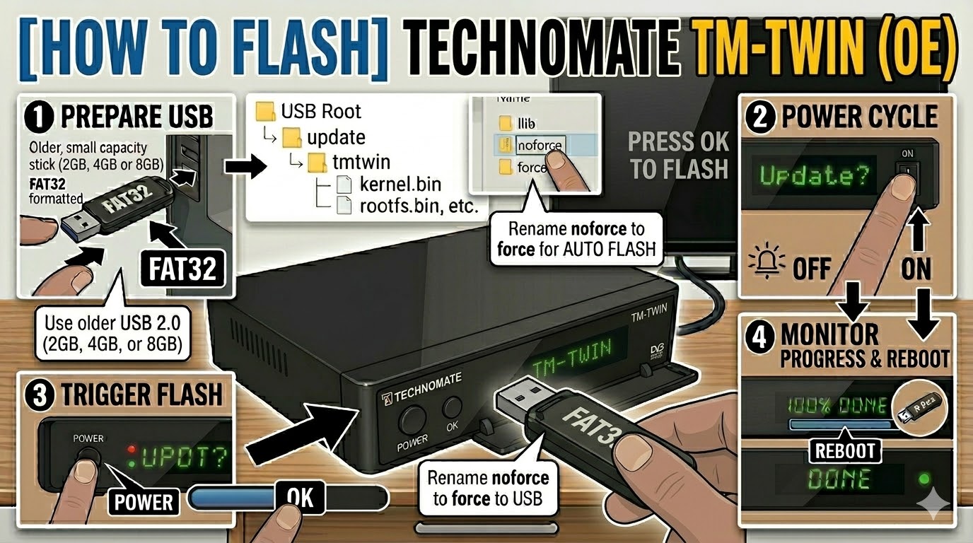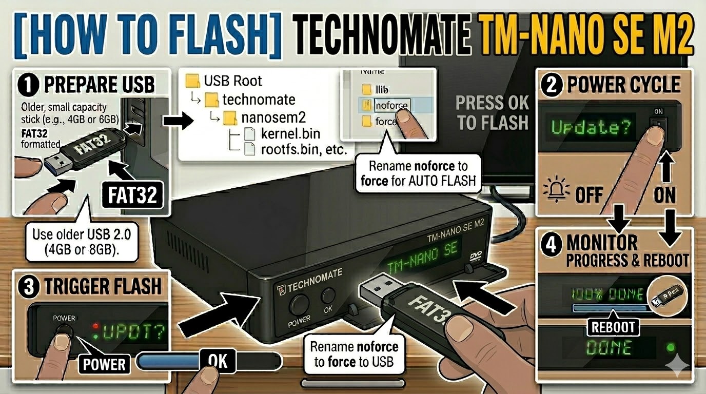 The Technomate TM-Nano SE M2 (the standard version without the “Plus” suffix) is a very common Broadcom-based Enigma2 receiver. It relies on a specific folder structure to initiate the flashing process during the boot sequence.