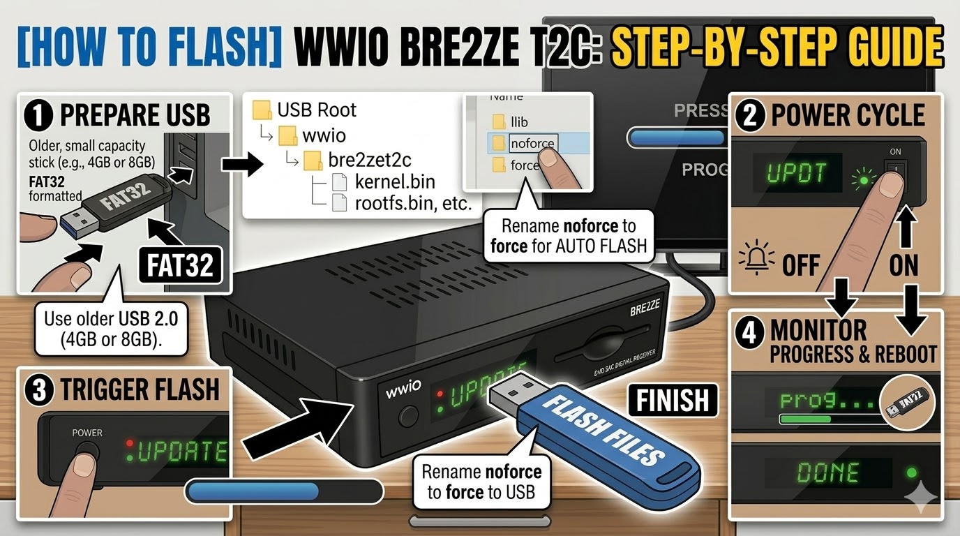 The WWIO BRE2ZE T2C is a popular H.265/HEVC Linux Enigma2 receiver. Flashing it follows the standard “power-cycle and confirm” method used by many Broadcom-based boxes.