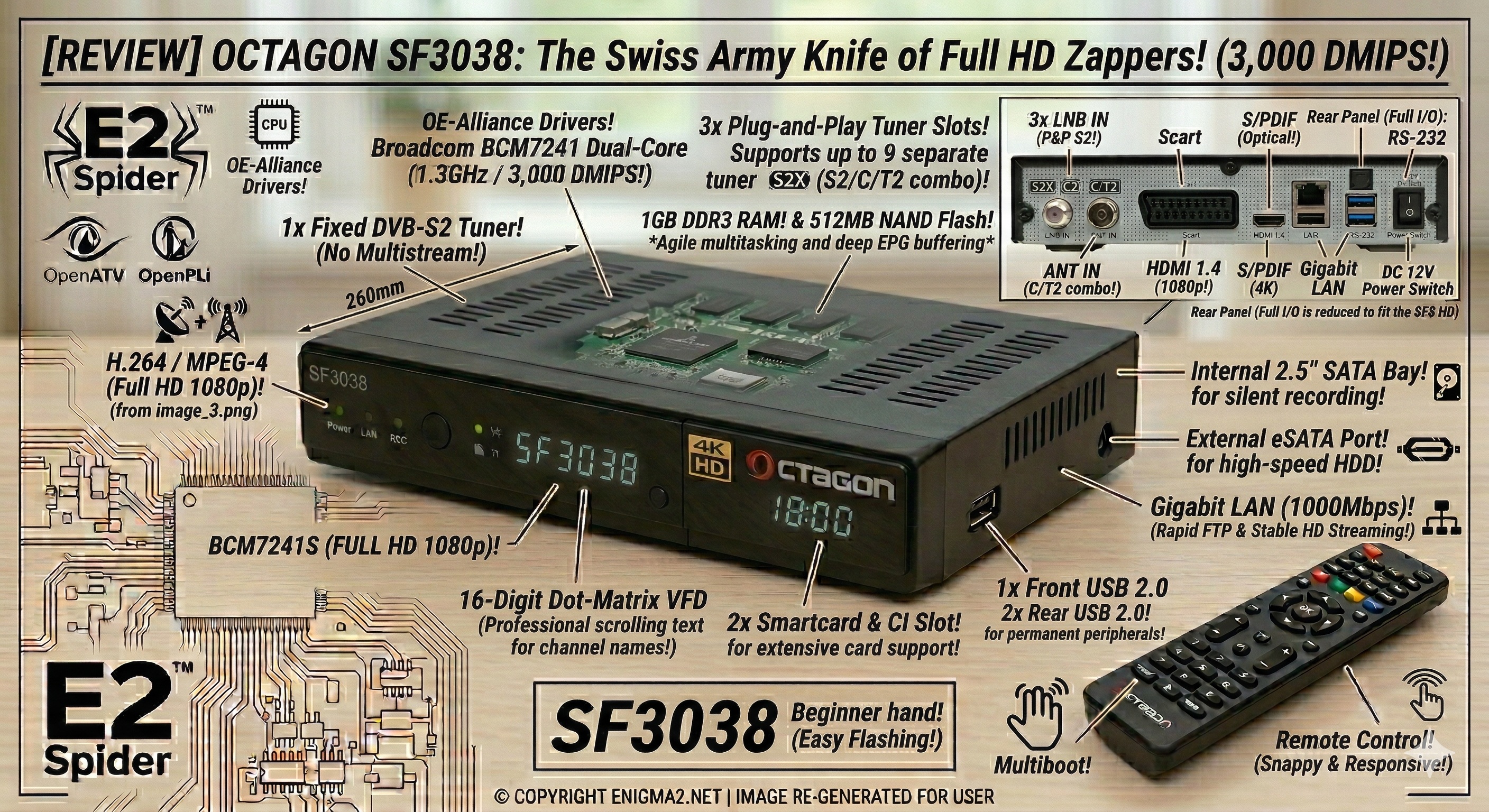 The Octagon SF3038 E2 HD is a “pro-sumer” Full HD machine that excels in tuner versatility and network speed. If your setup requires a reliable, multi-tuner satellite hub for recording and you don’t yet need 4K support, the SF3038’s Broadcom stability and Gigabit LAN make it a standout choice for the secondary rooms of any enigma2.net reader.