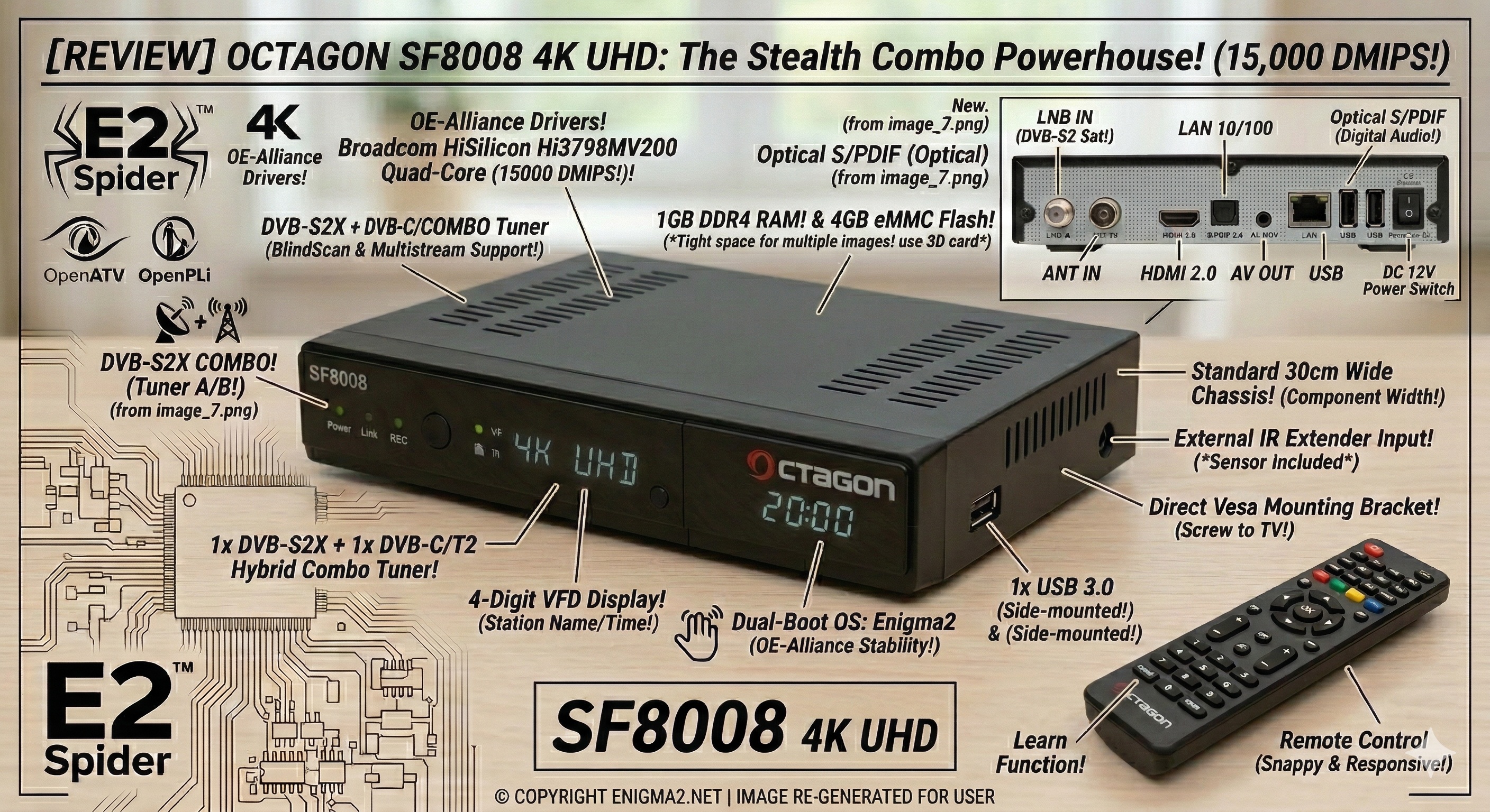 The Octagon SF8008 4K UHD is widely considered the gold standard for mid-range Linux receivers. It effectively ended the era of overpriced, sluggish hardware by delivering high-end silicon and specialized tuner capabilities at an aggressive price point. For the enigma2.net community, this is the definitive workhorse for 4K satellite and terrestrial reception.