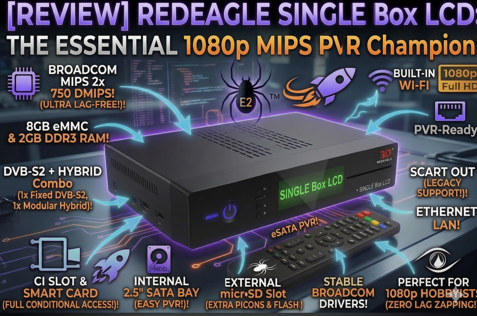 The compact Enigma2 market is often defined by compromises: small flash, low RAM, and single tuners. The RedEagle SINGLE Box LCD arrived to cut through the noise, establishing itself as the “Essential 1080p MIPS PVR Champion!“. It isn’t a miniature powerhouse trying to compete with 4K flagships; instead, it is a masterclass in perfecting the single-room 1080p experience, fitting true professional-grade Broadcom MIPS core performance, massive internal SATA PVR options, and triple-tuner flexibility into a standard-width (approx. 200mm) chassis.