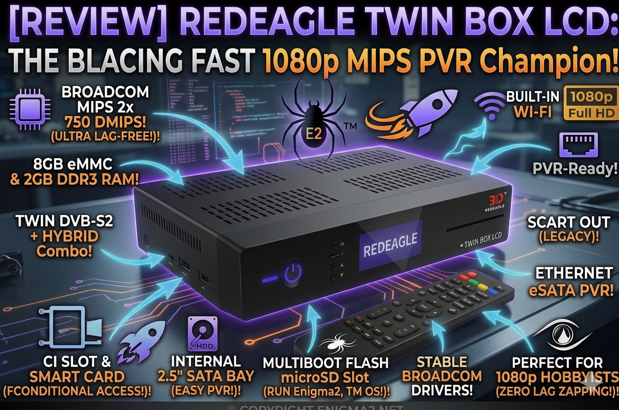 The RedEagle SINGLE Box LCD is a masterclass in compromise-free compact design. It takes all the lessons learned from previous “Nano” MIPS boxes and applies them to a standard-width, professional-grade chassis. It isn’t a 4K powerhouse. But for any user on enigma2.net who primarily watches 1080p content and values Broadcom stability, fast dual-core zapping, and, crucially, a silent internal SATA PVR and triple-tuner flexibility (DVB-S2 + DVB-C/T2), this is arguably the best single-room compact ever made.