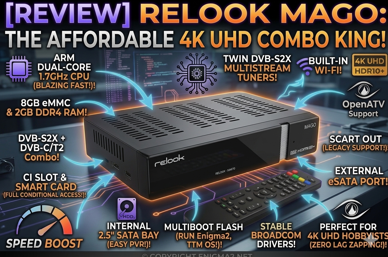 We are taking an in-depth look on enigma2.net to see how the Relook MAGO balances its serious hardware specifications, like its high-speed Broadcom ARM Dual-Core processor and massive internal SATA PVR options, against its highly competitive price point. For the serious hobbyist who needs versatility and speed, this is arguably the definitive “Affordable 4K” choice.