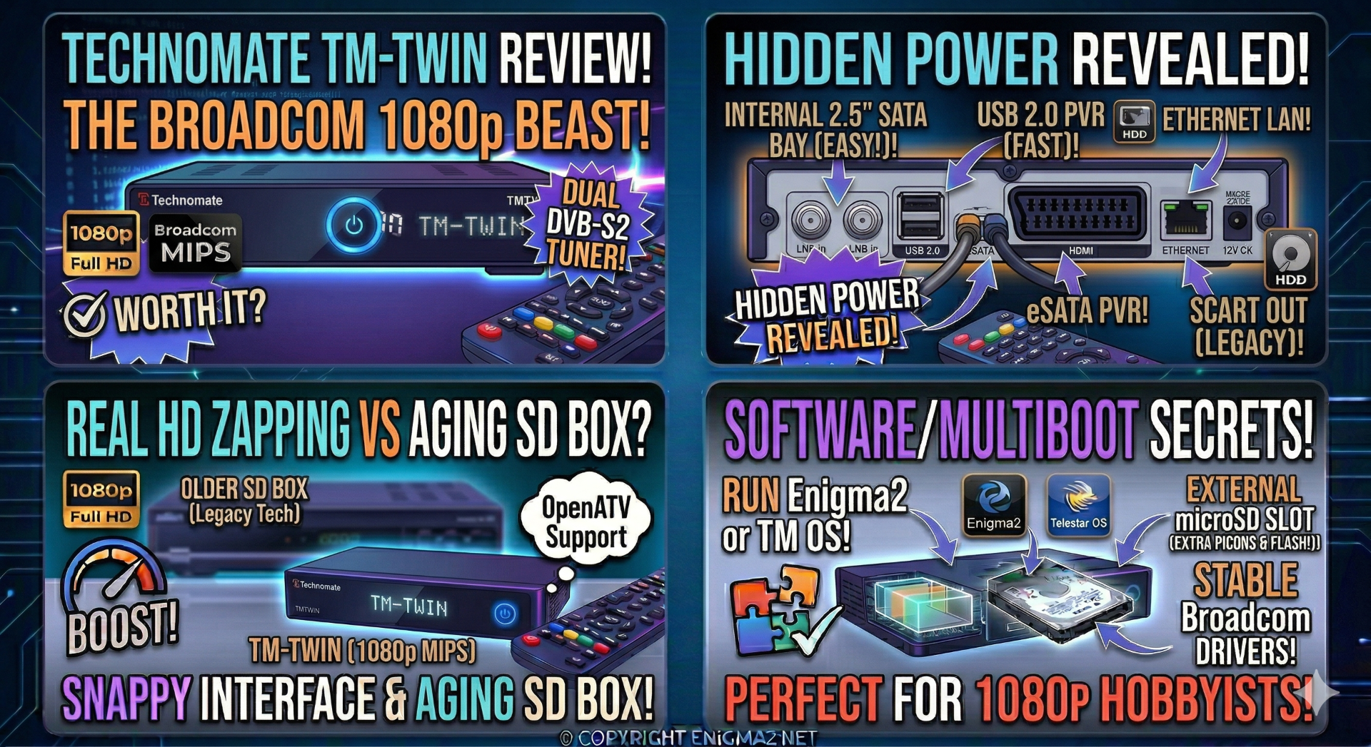 The Technomate TM-TWIN OE is a testament to why good hardware design never truly becomes obsolete. It isn’t a 4K powerhouse, but for any user on enigma2.net who primarily watches 1080p content and values driver stability, fast zapping, and a proper internal SATA PVR, this is arguably one of the best receivers ever made.