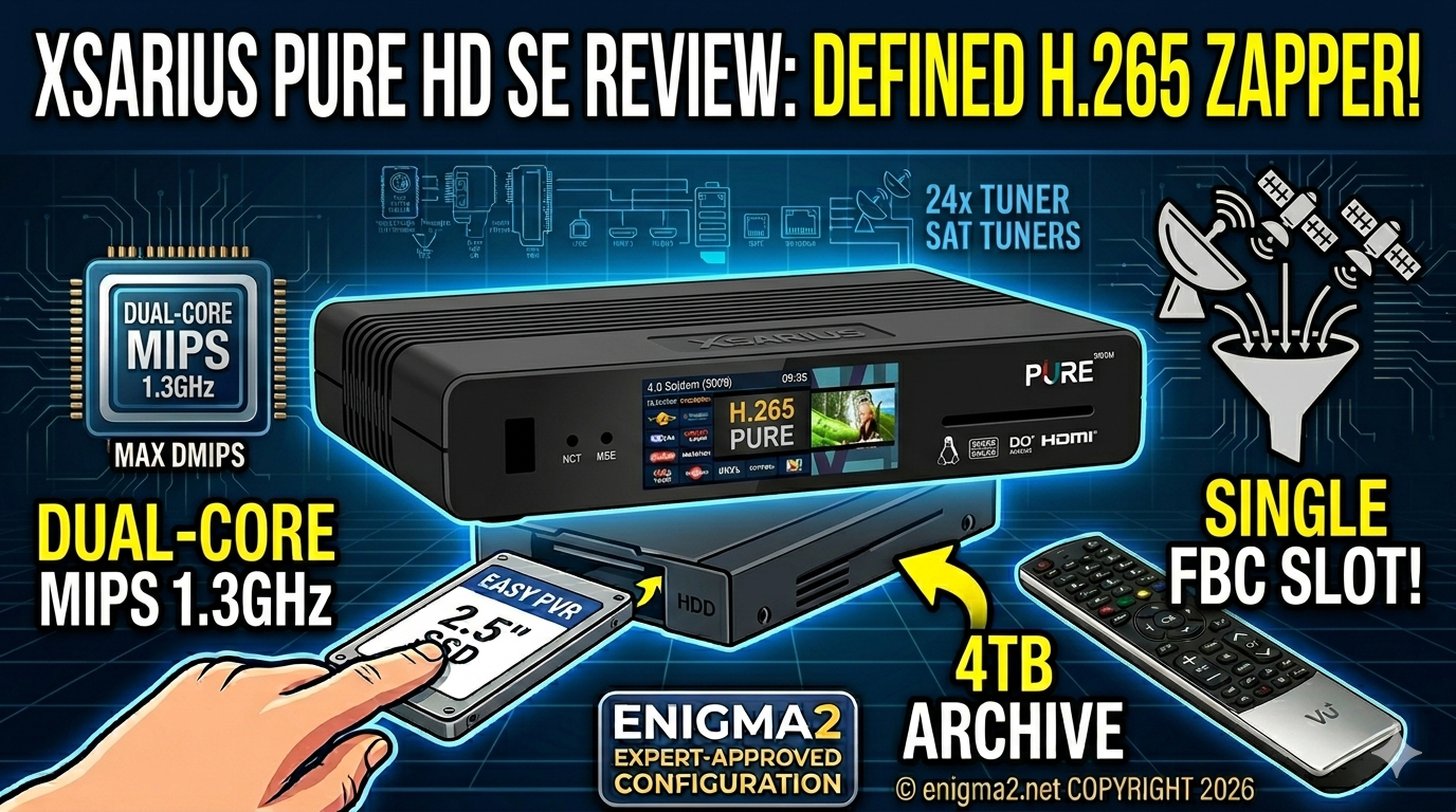 The original Duo defined the twin-tuner generation (as TechRadar noted in 2010), and high-end FBC boxes like the Revo 4K set the benchmark for heavy multitaskers. The XSARIUS PURE HD SE (Special Edition, see image_159.png) enters the market with a radically different proposition: it is the stripped-down, performance-focused zapper. Abandoning the front-panel displays, internal HDD bays, and multi-tuner complexity of its siblings, the Pure HD SE focuses entirely on delivering blazing-fast H.265/HEVC decoding and snappy responsiveness in the most efficient and affordable single-tuner package available. I evaluate it from an “Enigma2 expert” perspective, to see if this compact multitasker succeeds by doing “less” but doing it perfectly.