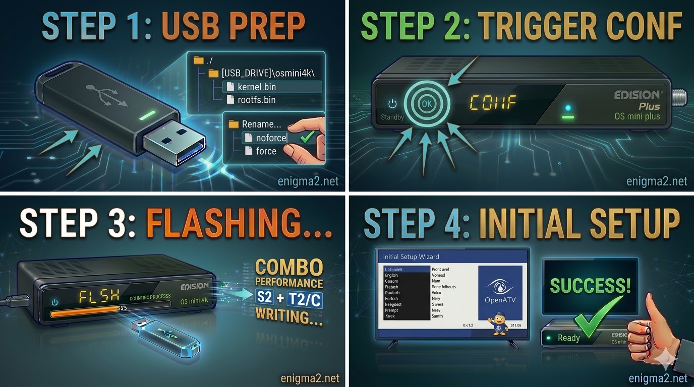 • The Folder Path: Extract the Enigma2 image (OpenATV, OpenPLi, etc.). The root of your USB drive must contain a folder named: