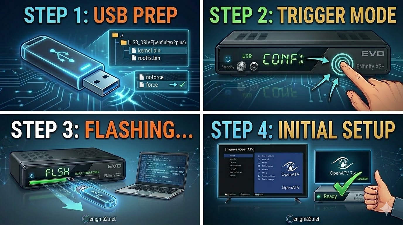 The EVO ENfinity X2+ (Triple Tuner) is a powerful Linux-based Enigma2 receiver. Much like the Nova and Slim models you’ve worked with for enigma2.net, it relies on a specific USB directory structure to trigger the flash.