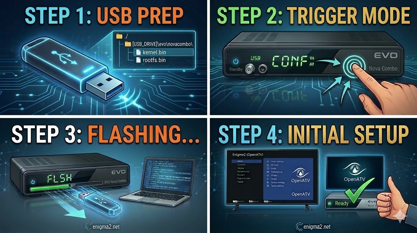 The EVO Nova Combo (also known as the Optibox EVO Nova Combo) is a versatile receiver that includes both Satellite (DVB-S2) and Terrestrial/Cable (DVB-T2/C) tuners. Flashing it requires the specific “novacombo” folder structure to be recognized by the bootloader.