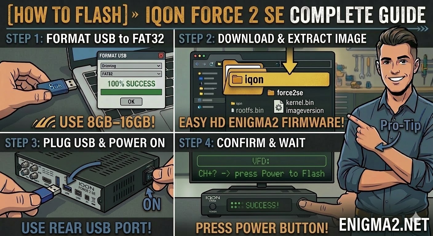 To flash the IQON Force 2 SE, you will follow the standard procedure for this popular Broadcom-based HD receiver. The “SE” (Second Edition) is a refined version of the Force 2 and requires the specific folder structure to be recognized by the bootloader during start-up.