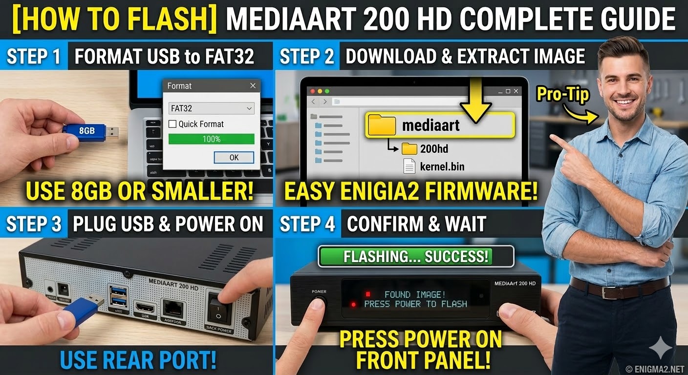 The MediaArt 200 HD is a bit of a “hidden gem” in the budget Broadcom category. On your site, remind users that the folder name mediaart is case-sensitive and must be in lowercase. If the box boots directly to the old image, it’s usually because the folder structure is wrong or the USB stick isn’t being read properly by the bootloader.