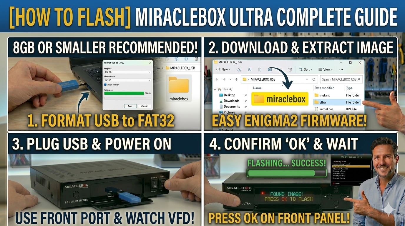 To flash the Miraclebox Premium Ultra HD, you will follow the standard procedure for Broadcom-based receivers. This model is a high-end, multi-tuner box that uses a specific folder name to trigger the update process.