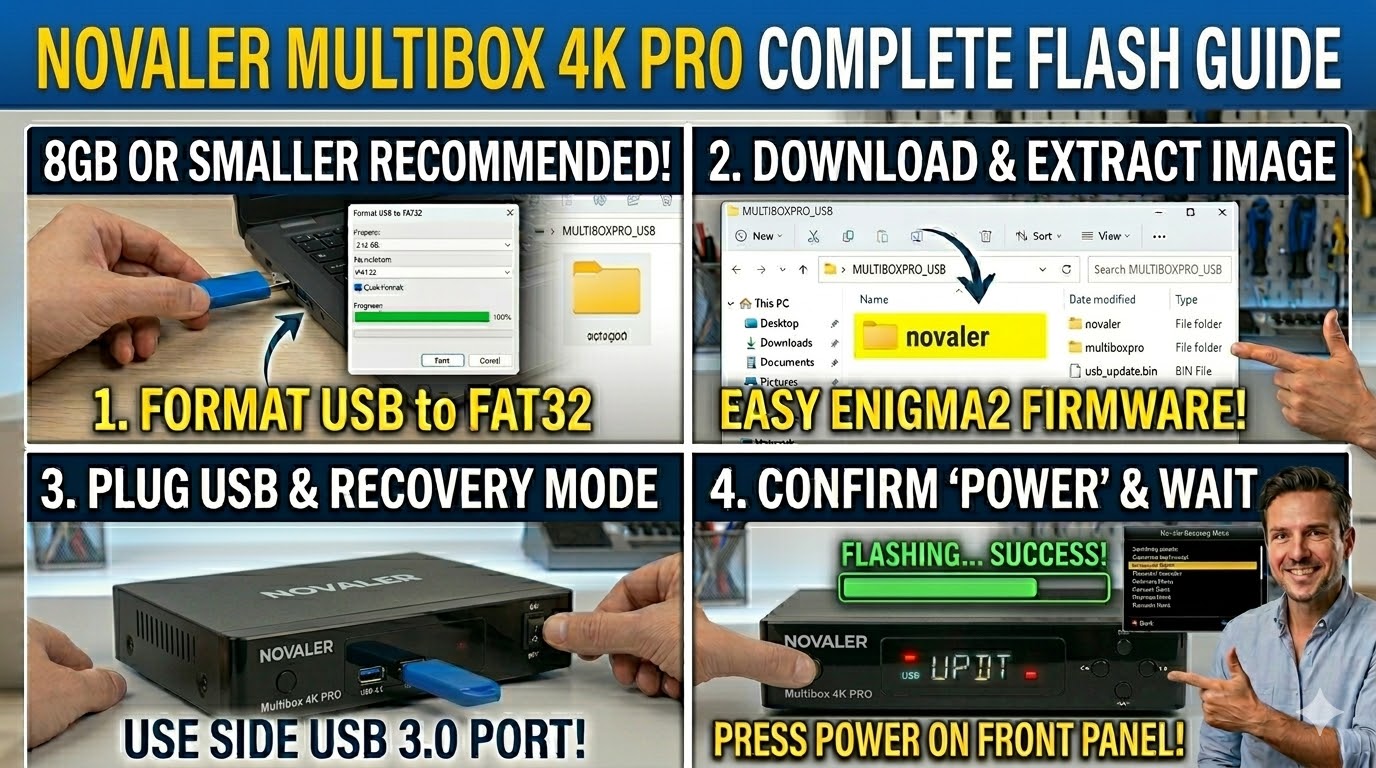To flash the Novaler Multibox 4K PRO, the process is almost identical to the SE version, as it uses the same HiSilicon multiboot architecture. The “PRO” model often features upgraded hardware (like 2GB RAM), but the recovery method remains the standard USB-to-Menu sequence.