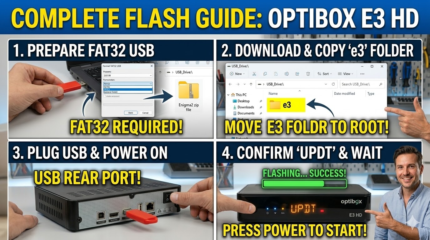 To flash your Optibox E3 HD, you’ll need a USB stick and a compatible Enigma2 firmware image (like OpenATV, OpenPLi, or OpenDroid). The process is straightforward but requires a specific folder structure to be recognized by the bootloader.