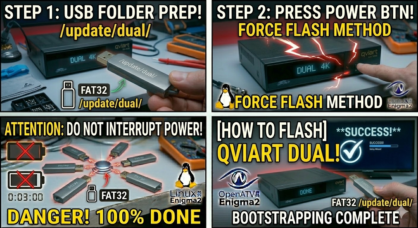 To flash the standard Qviart Lunix (the original HD model), the process is identical to its siblings but relies on its specific hardware folder name. This box is very stable but requires the exact folder structure to trigger the bootloader.