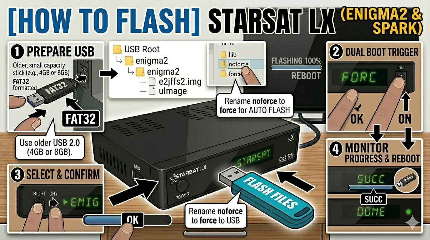 The StarSat LX is an Enigma2-based receiver that belongs to the “Spark” family of dual-boot devices. Flashing it requires a specific folder structure to trigger the bootloader during the startup sequence.
