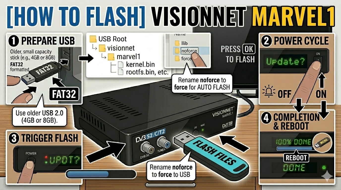 The VisionNet Marvel1 is a specialized Enigma2 receiver that relies on a specific folder structure to trigger its update mode. It’s known for being a bit sensitive to USB types, so following the preparation steps closely is key.