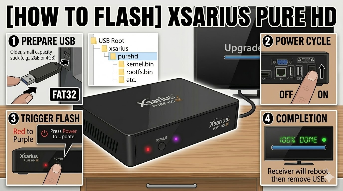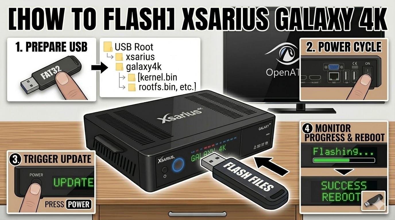 The Xsarius Galaxy 4K is a high-end Enigma2 receiver with a built-in display. The flashing process is very similar to the Revo 4K but relies on the front panel’s VFD to confirm the update.
