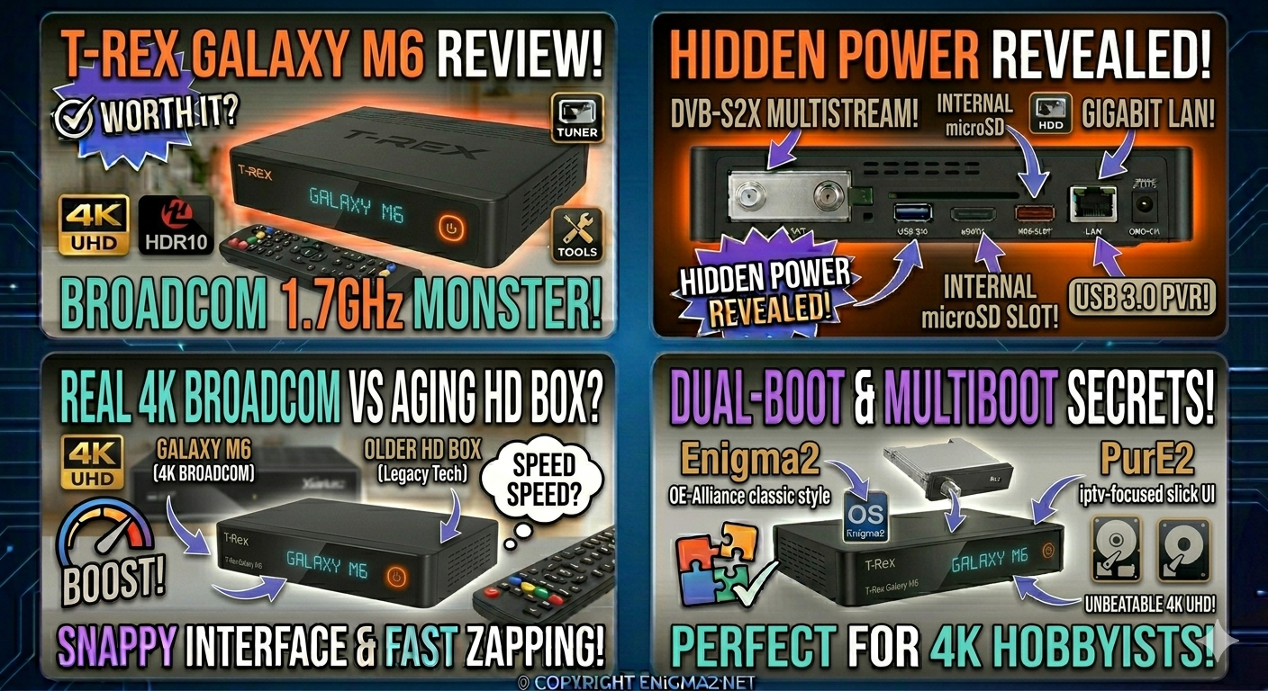 The T-Rex Galaxy M6 is a high-performance “workhorse.” It’s designed for the user on enigma2.net who values Broadcom reliability, Gigabit speeds, and Multistream satellite feeds over a fancy “Netflix-style” interface.