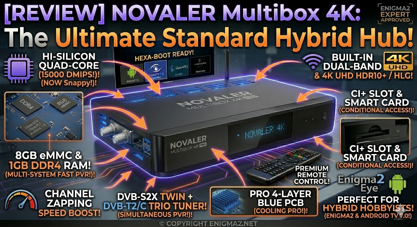 The Novaler Multibox 4K PRO Ultra HD remains a powerhouse in the Enigma2 world as of 2026, building on its reputation as the “Hexa-boot” king. For those managing advanced setups or satellite tech sites, this box represents the pinnacle of mid-range hybrid hardware.