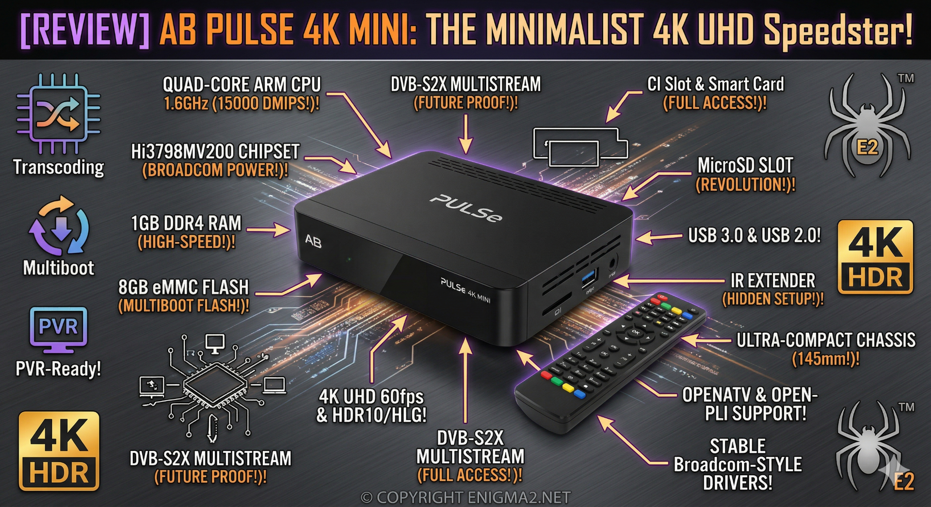 For the enigma2.net hobbyist, the PULSe 4K MINI offers the perfect balance: a tiny footprint that hides behind a TV (thanks to the included IR extender) and the reliability of a Broadcom-style ARM architecture that handles OpenATV and OpenPLi with effortless grace.