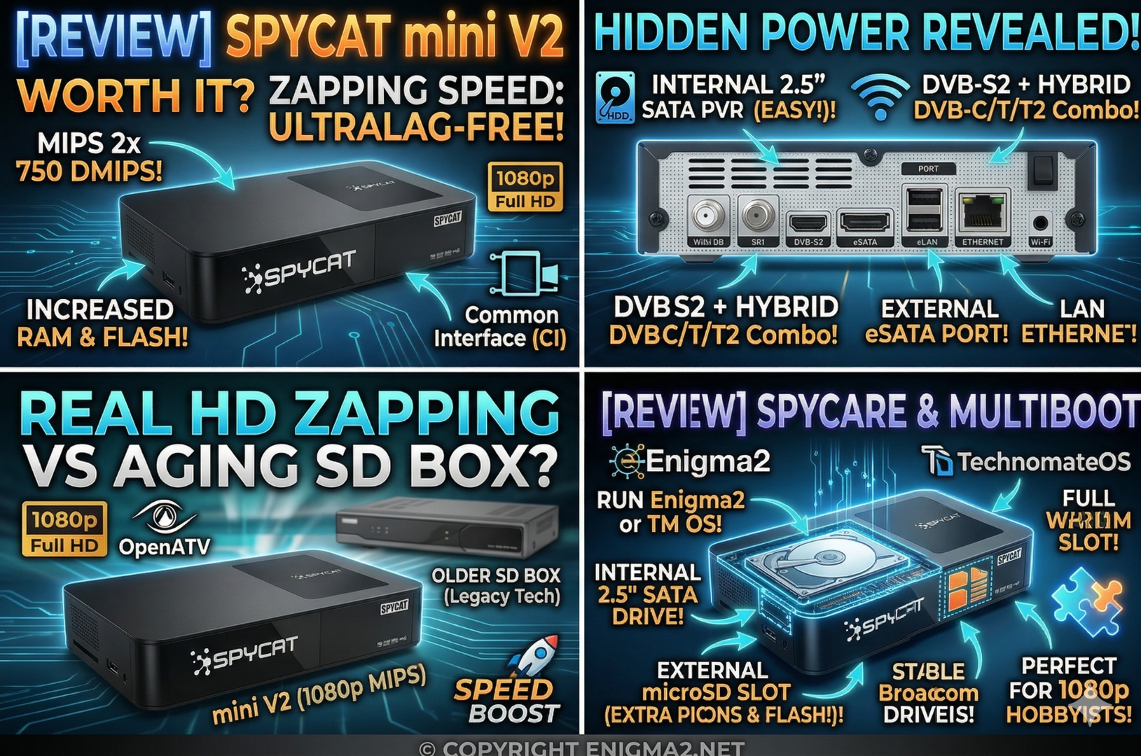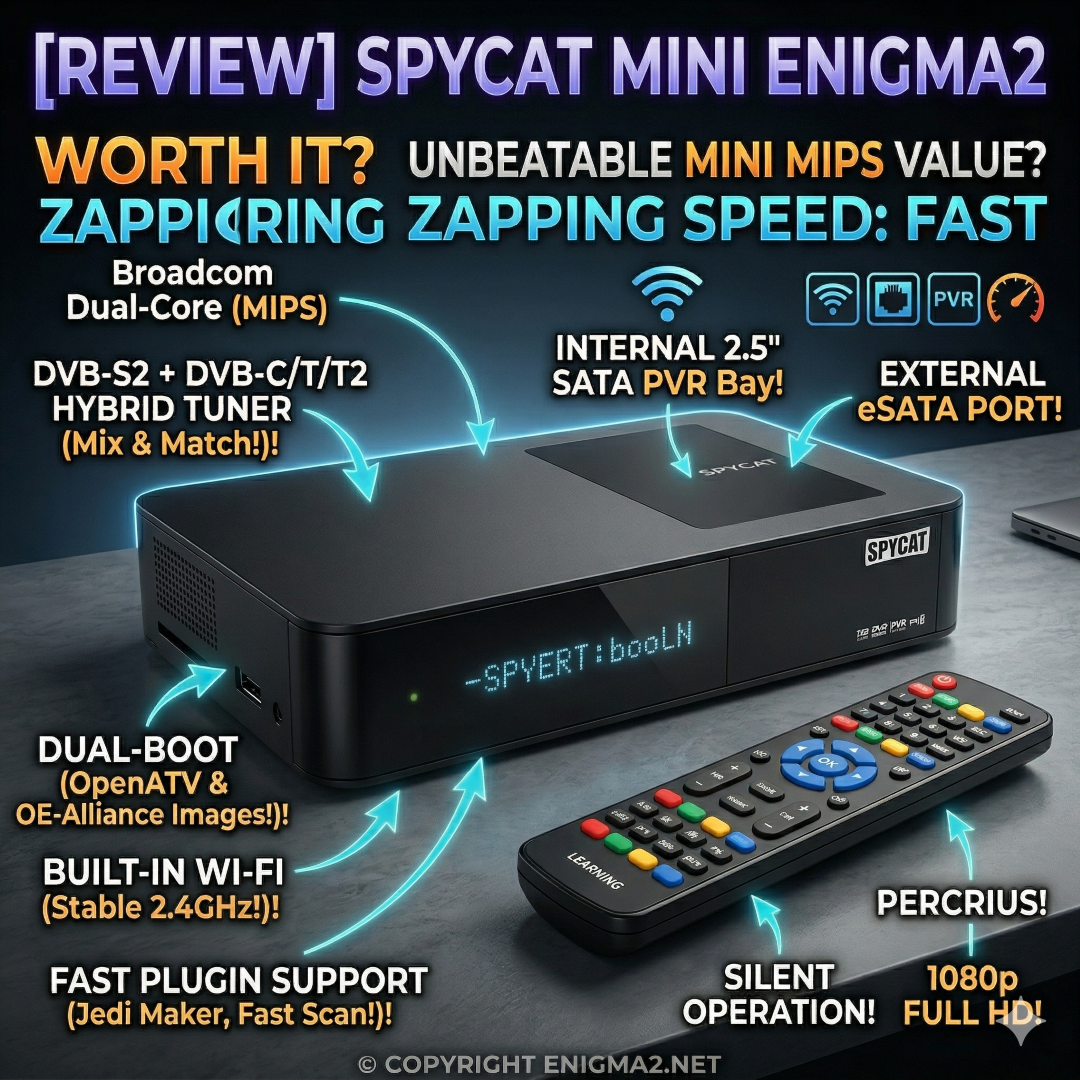 The Spycat Mini Enigma2 is a masterclass in compromise-free compact design. It isn’t a 4K powerhouse. But for any user on enigma2.net who primarily watches 1080p content and values Broadcom stability, fast dual-core zapping (2x 750 DMIPS), and, crucially, a silent internal SATA PVR and twin-tuner flexibility, this is arguably the best single-room compact ever made.