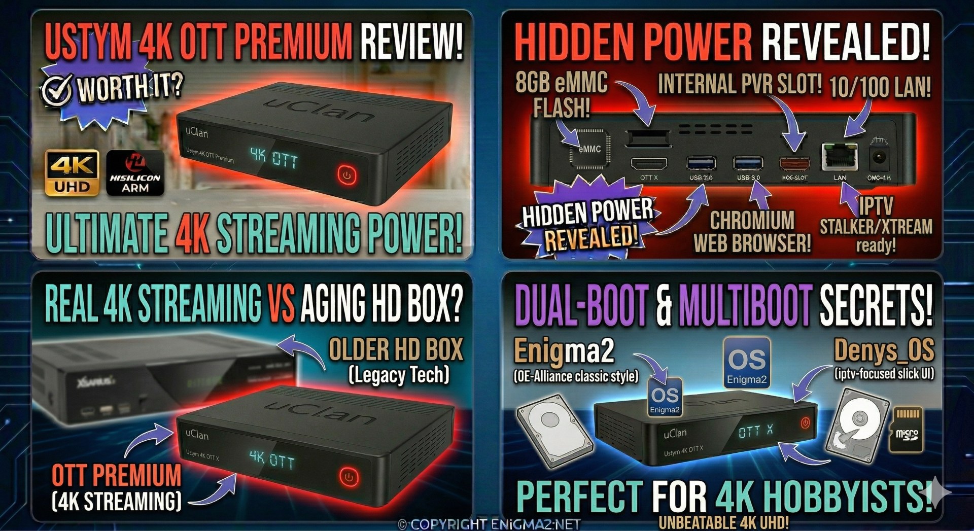 The uClan Ustym 4K OTT Premium is the top-tier “pure streaming” model in the Ustym lineup. While it lacks the physical satellite/cable tuners of the “PRO” model, it compensates by offering more flash storage and a superior remote control, making it the preferred choice for high-end IPTV and OTT users on enigma2.net.