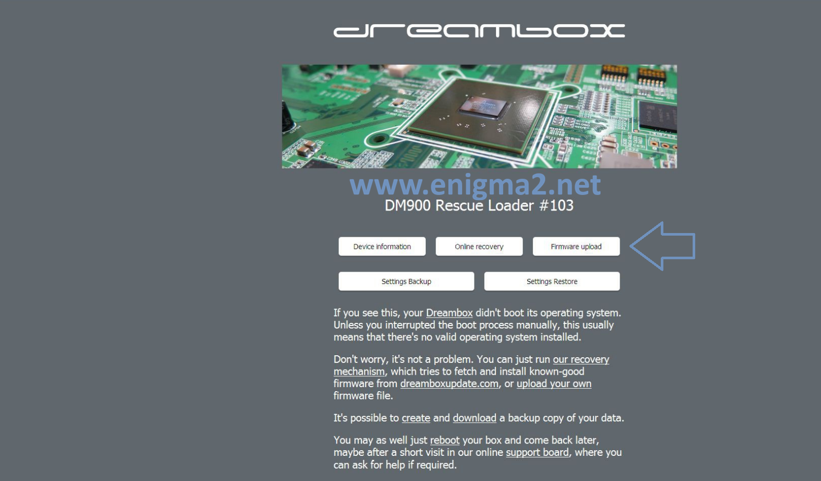 6.) You will see Rescue Mode of DM900 . Click “Firmware upload”